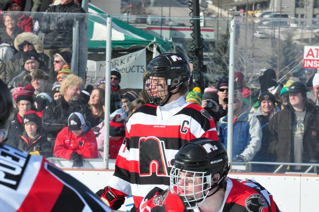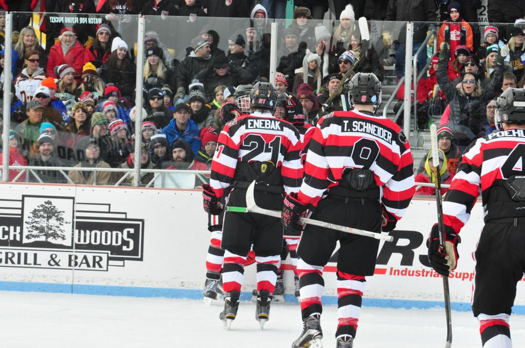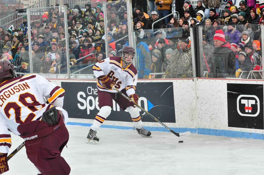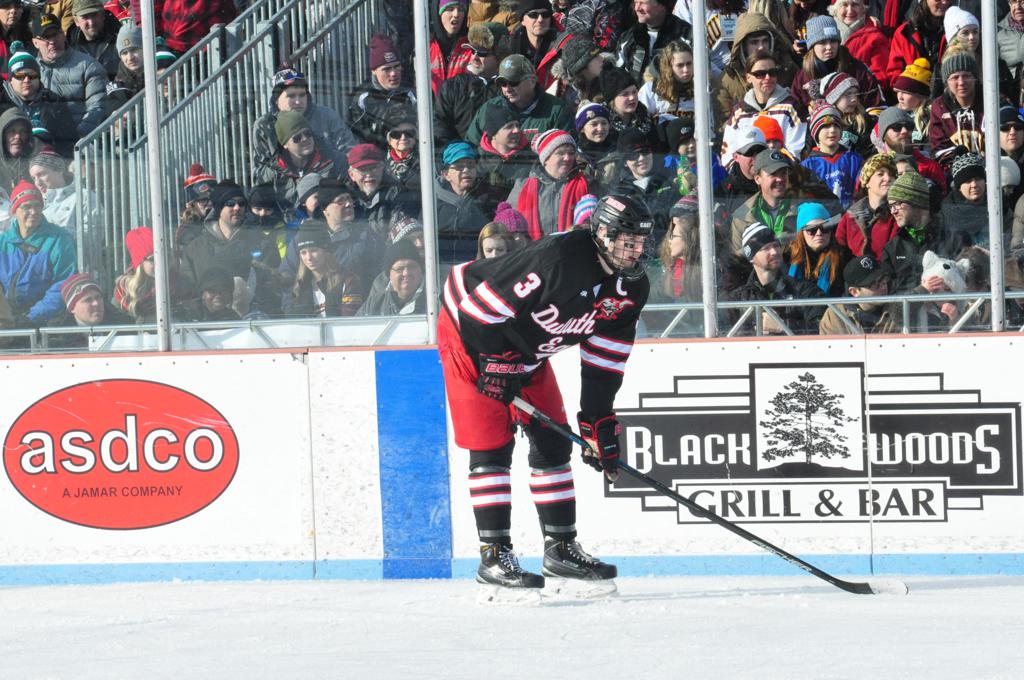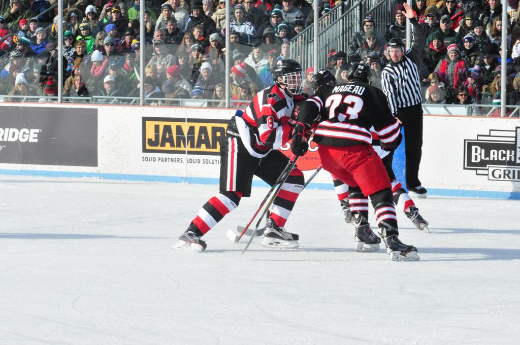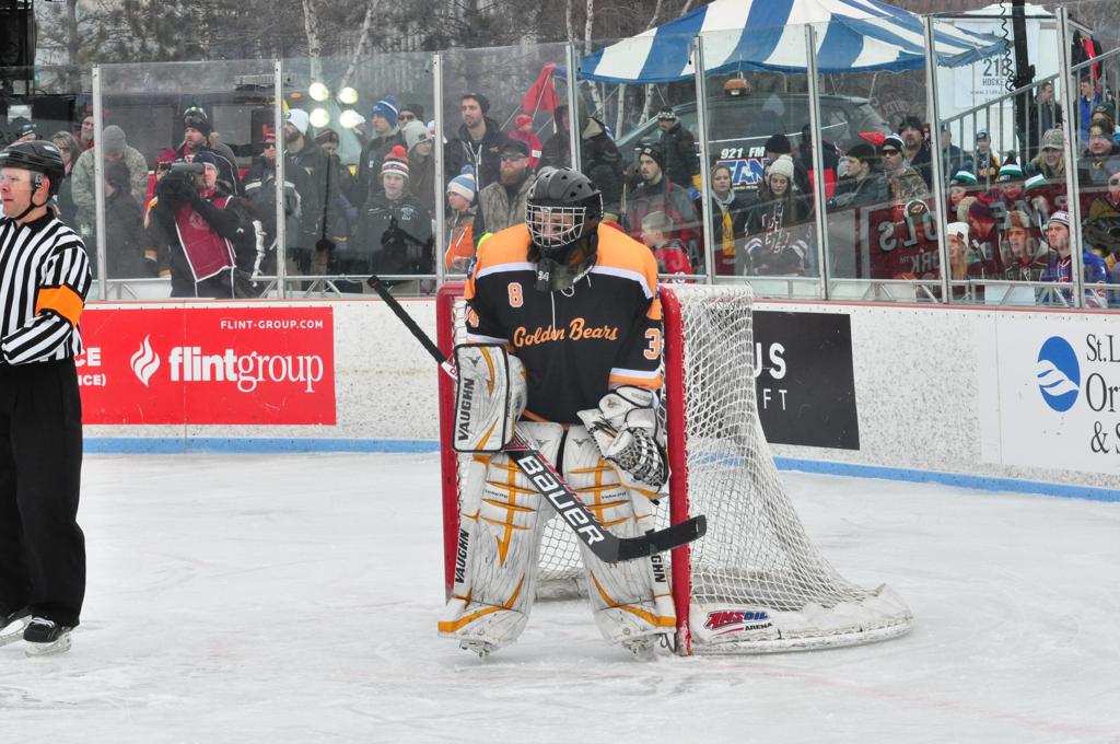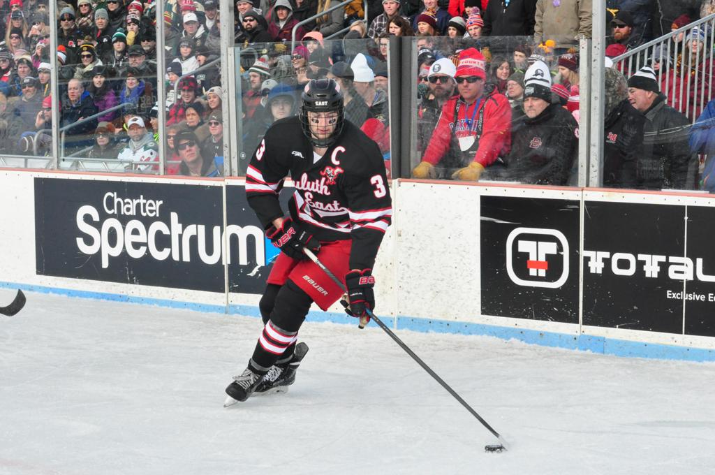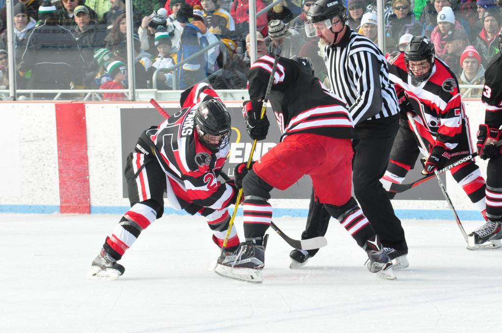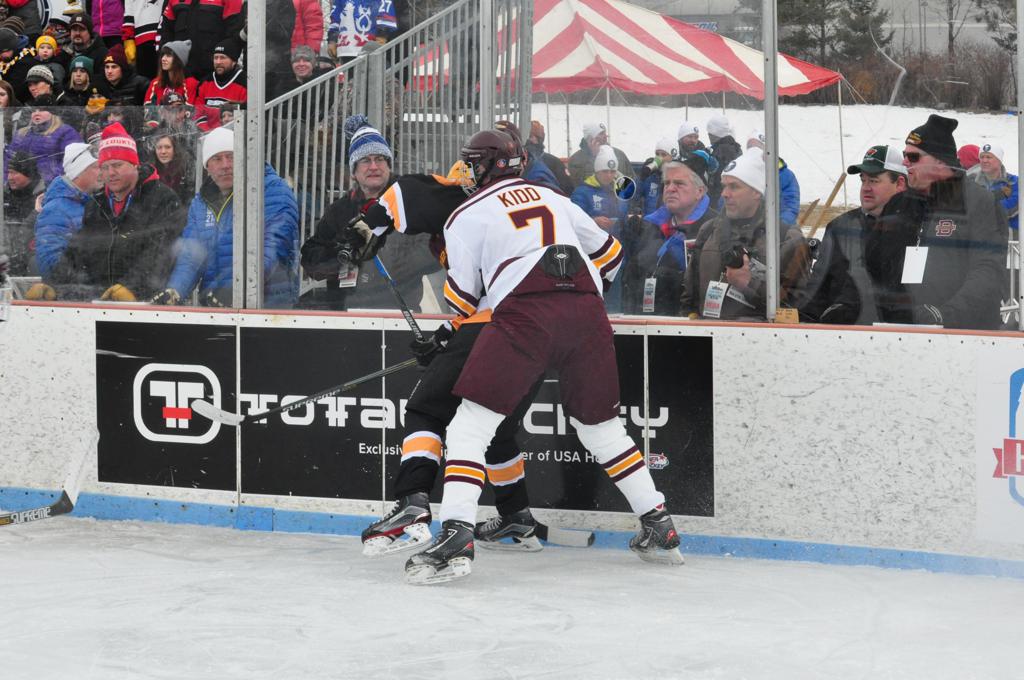 The afternoon marquee game between home-town Greyhounds of Duluth East vs. the visiting Panthers of Lakeville North began with Duluth hockey legends Jerry & Bob Fryberger dropping the ceremonial puck-drop. The game was quite the hard fought close game, between two Class AA powerful schools - both in striking red and black uniforms against the white ice - made for great images on the sunny day. Visiting Lakeville edged East by a close 3-2 regulation win. One thing that was quite odd and rather upsetting about HDM was the long LOUD hovering helicopter with camera man shooting footage through an open side door over the rink and crowd, it was so nousy on-site, spectators and players alike on the ice had a hard time hearing the referee whistles (fans on TV also had a hard time hearing the broadcast as the chopper blades were resonating through the microphones as well). Another quite upsetting thing, that led to collegiate changes going forward was - Duluth UMD Bulldogs Hockey team had a slated HOME game that afternoon - which Amsoil Arena was literally within eye site, and a few paces away by foot of the Duluth Bayfront Park, but were not apart of HDM. Fans at this time on social media started to gripe that this wasn't a Hockey Day Minnesota for all teams across the State - but was merely a Gophers Hockey Day, as the University of Minnesota had participated in every HDM to date. Things were about to change going forward in future years, to showcase ALL of the states Collegiate programs.