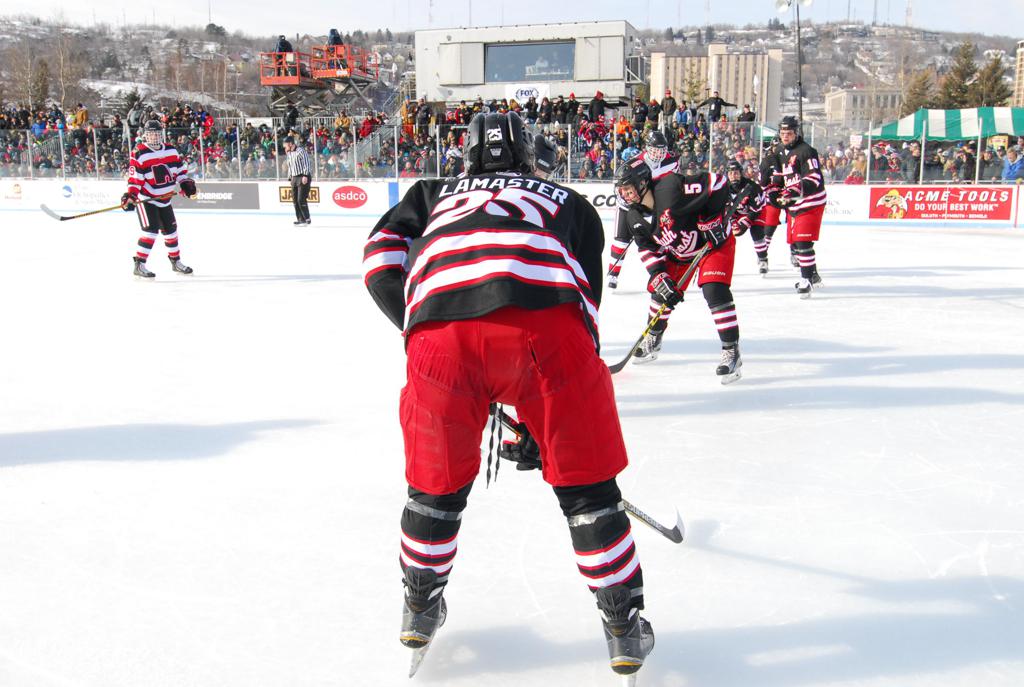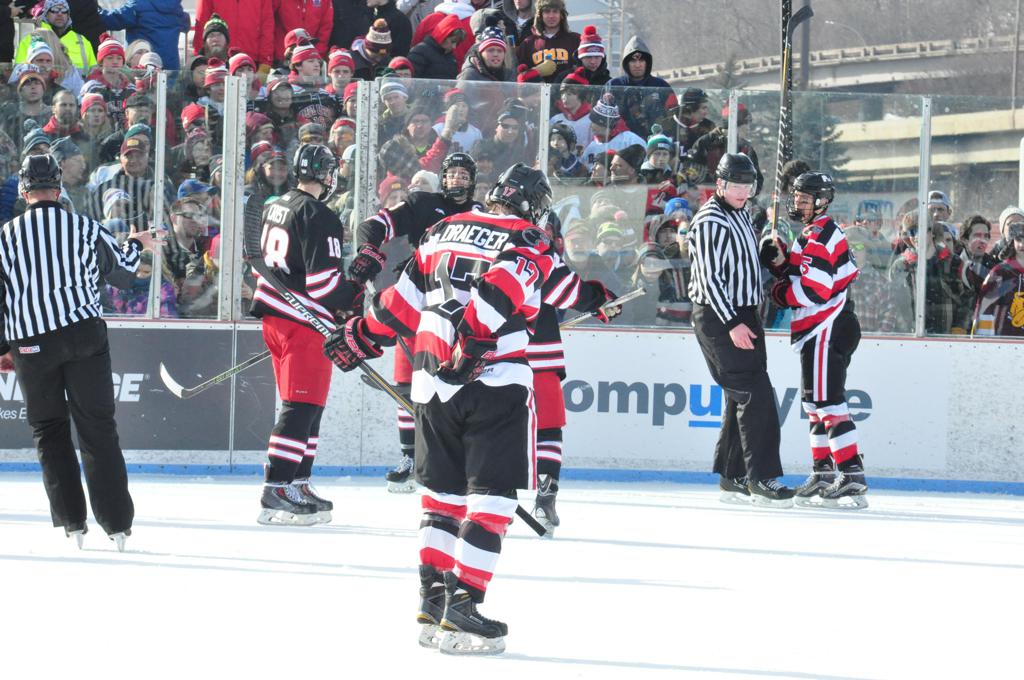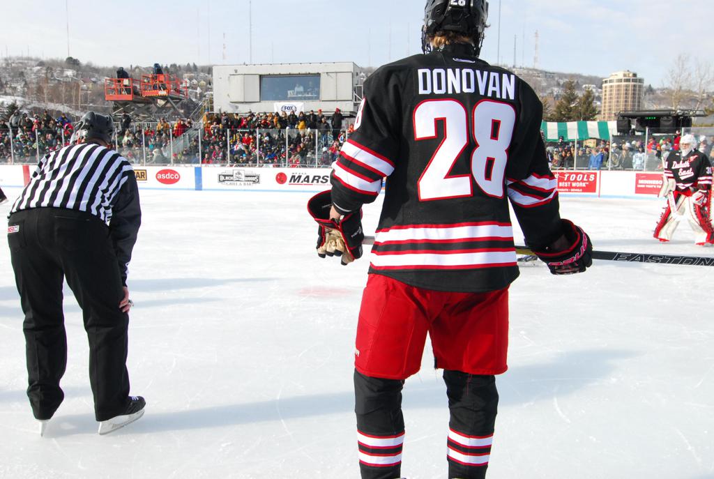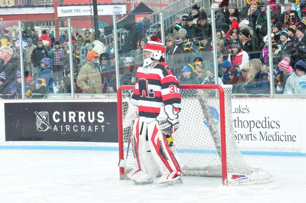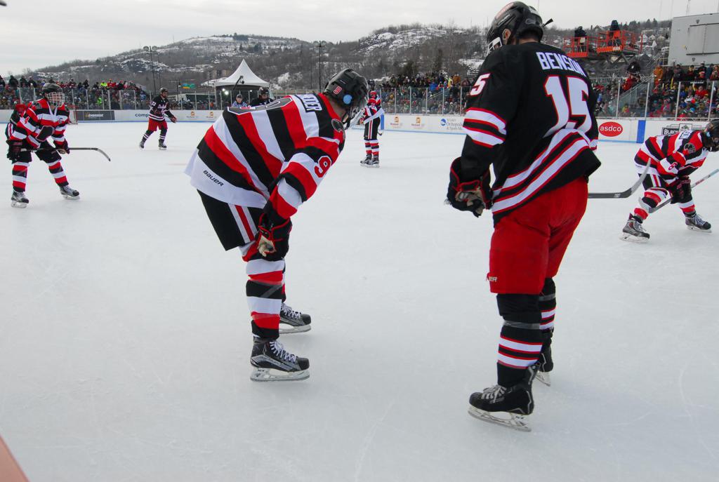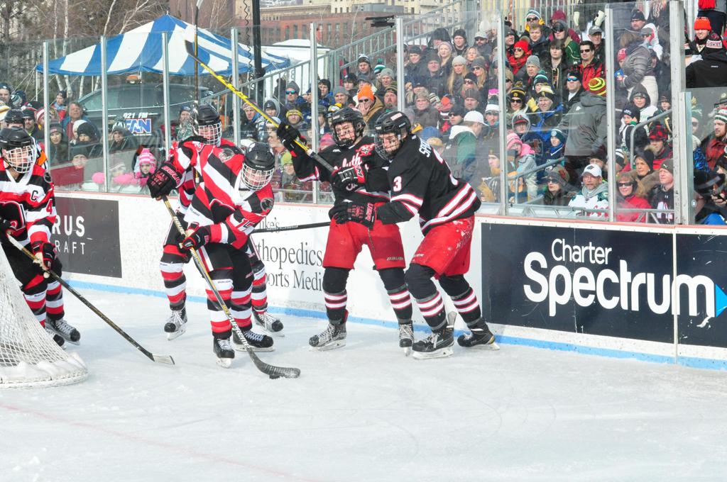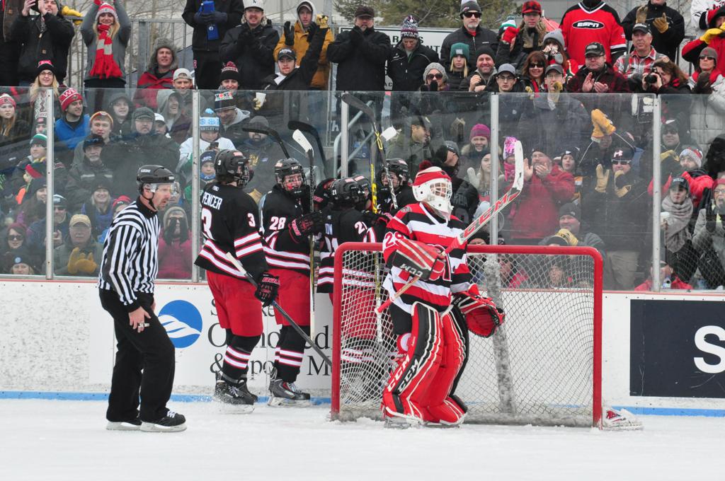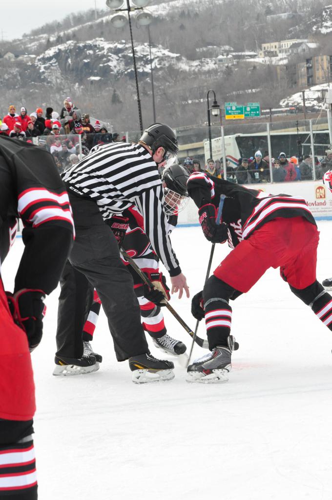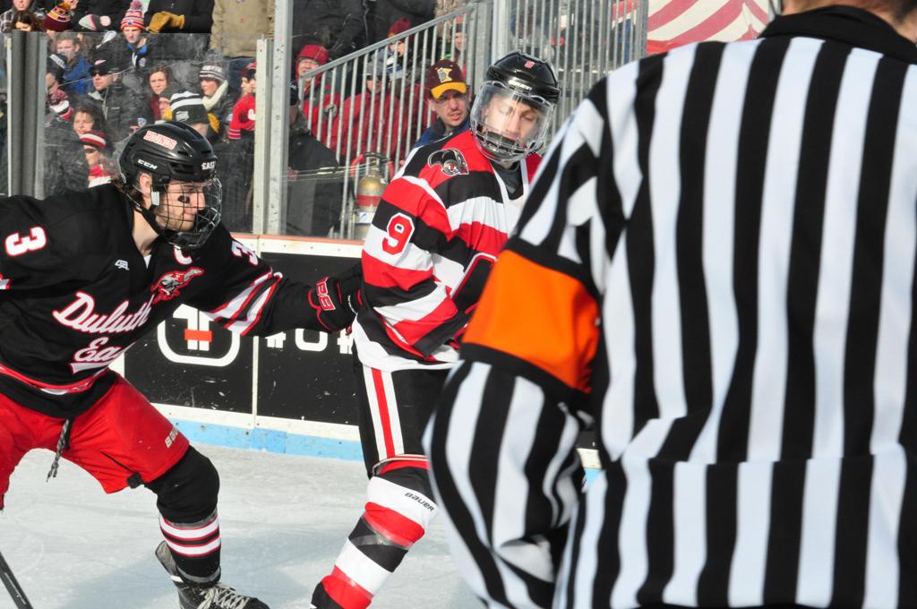 The afternoon marquee game between home-town Greyhounds of Duluth East vs. the visiting Panthers of Lakeville North began with Duluth hockey legends Jerry & Bob Fryberger dropping the ceremonial puck-drop. The game was quite the hard fought close game, between two Class AA powerful schools - both in striking red and black uniforms against the white ice - made for great images on the sunny day. Visiting Lakeville edged East by a close 3-2 regulation win. One thing that was quite odd and rather upsetting about HDM was the long LOUD hovering helicopter with camera man shooting footage through an open side door over the rink and crowd, it was so nousy on-site, spectators and players alike on the ice had a hard time hearing the referee whistles (fans on TV also had a hard time hearing the broadcast as the chopper blades were resonating through the microphones as well). Another quite upsetting thing, that led to collegiate changes going forward was - Duluth UMD Bulldogs Hockey team had a slated HOME game that afternoon - which Amsoil Arena was literally within eye site, and a few paces away by foot of the Duluth Bayfront Park, but were not apart of HDM. Fans at this time on social media started to gripe that this wasn't a Hockey Day Minnesota for all teams across the State - but was merely a Gophers Hockey Day, as the University of Minnesota had participated in every HDM to date. Things were about to change going forward in future years, to showcase ALL of the states Collegiate programs.