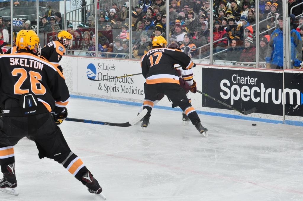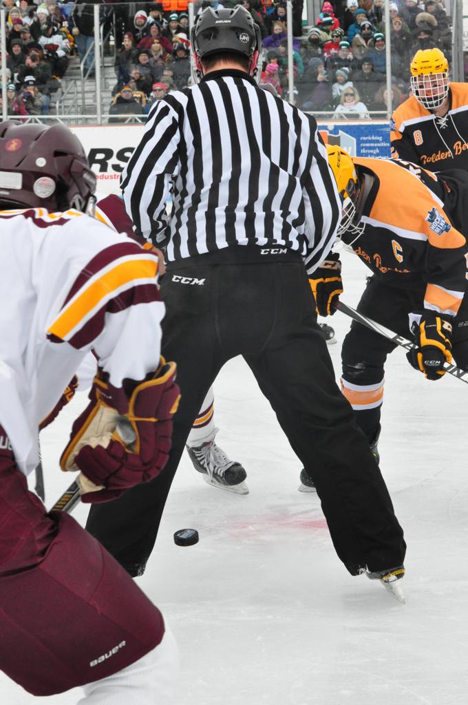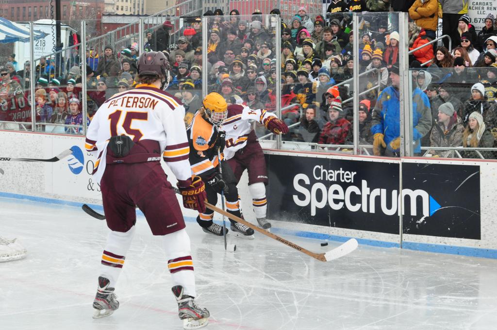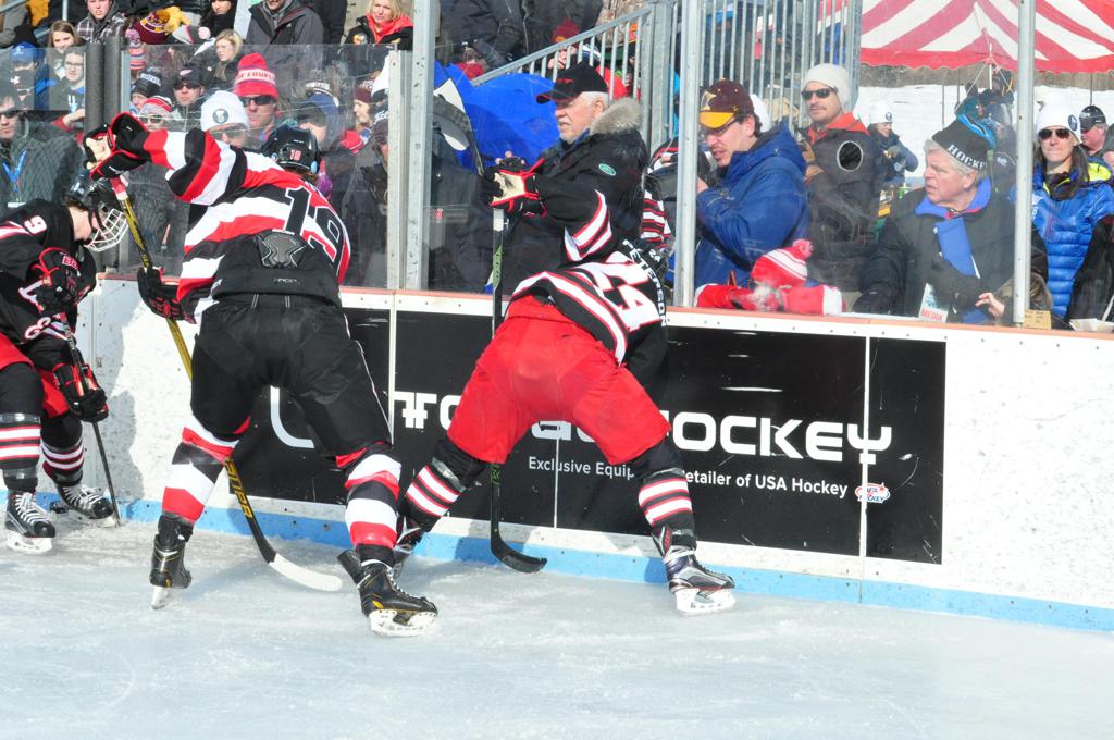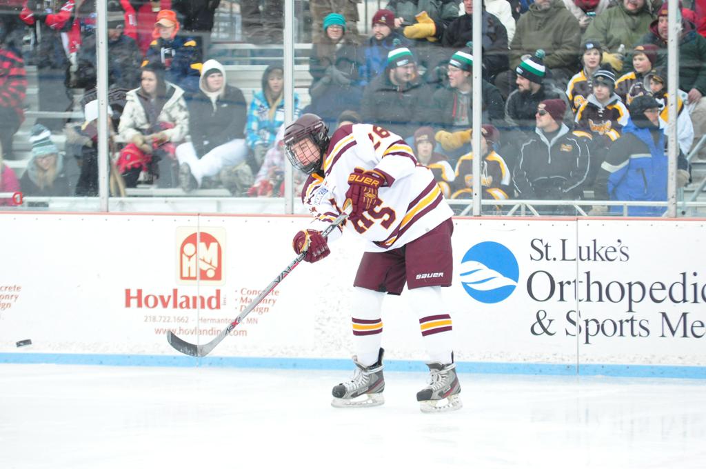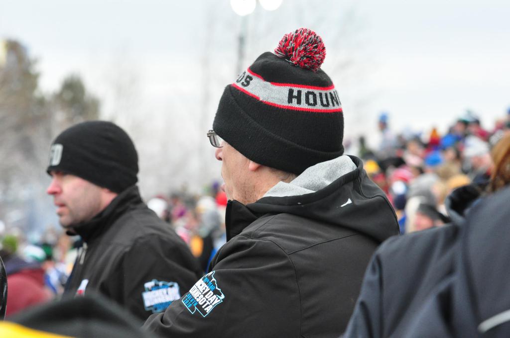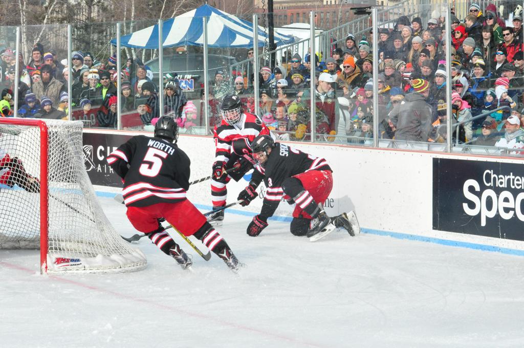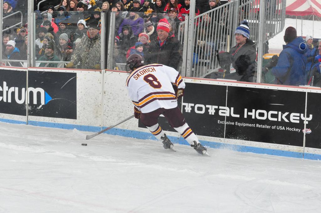 The afternoon marquee game between home-town Greyhounds of Duluth East vs. the visiting Panthers of Lakeville North began with Duluth hockey legends Jerry & Bob Fryberger dropping the ceremonial puck-drop. The game was quite the hard fought close game, between two Class AA powerful schools - both in striking red and black uniforms against the white ice - made for great images on the sunny day. Visiting Lakeville edged East by a close 3-2 regulation win. One thing that was quite odd and rather upsetting about HDM was the long LOUD hovering helicopter with camera man shooting footage through an open side door over the rink and crowd, it was so nousy on-site, spectators and players alike on the ice had a hard time hearing the referee whistles (fans on TV also had a hard time hearing the broadcast as the chopper blades were resonating through the microphones as well). Another quite upsetting thing, that led to collegiate changes going forward was - Duluth UMD Bulldogs Hockey team had a slated HOME game that afternoon - which Amsoil Arena was literally within eye site, and a few paces away by foot of the Duluth Bayfront Park, but were not apart of HDM. Fans at this time on social media started to gripe that this wasn't a Hockey Day Minnesota for all teams across the State - but was merely a Gophers Hockey Day, as the University of Minnesota had participated in every HDM to date. Things were about to change going forward in future years, to showcase ALL of the states Collegiate programs.