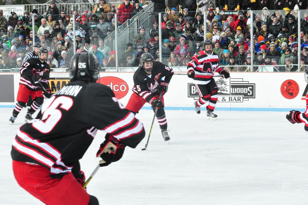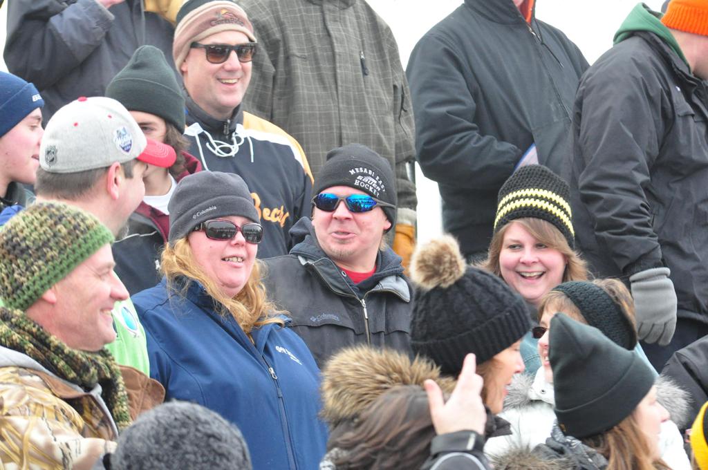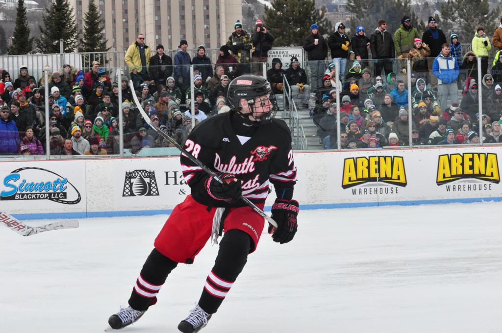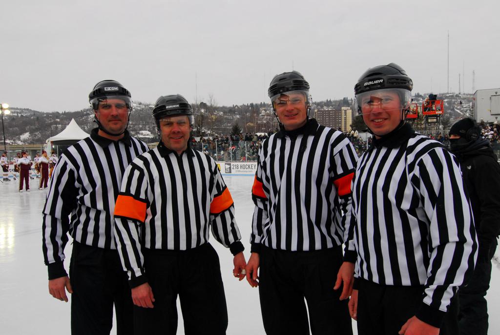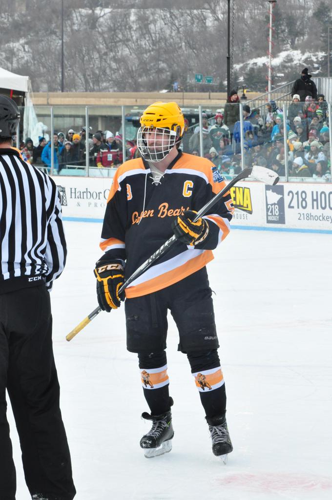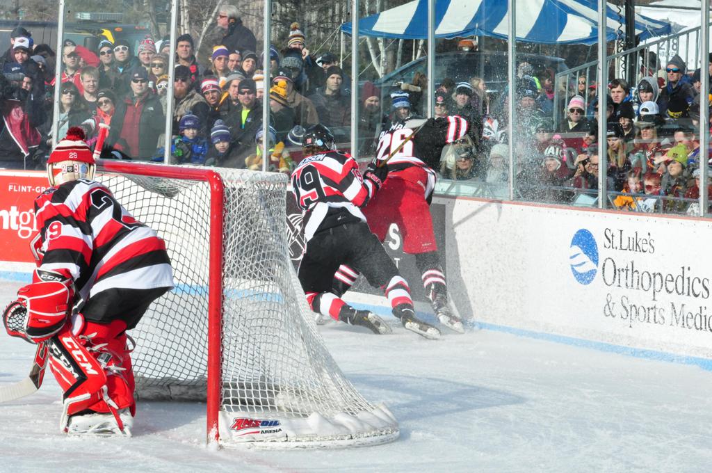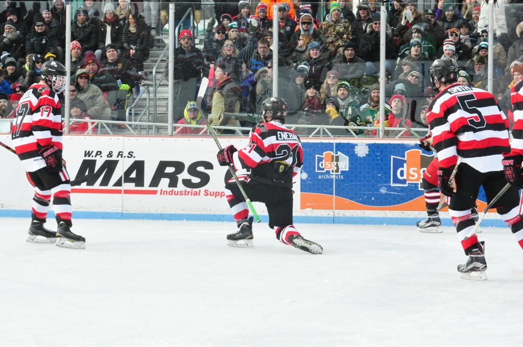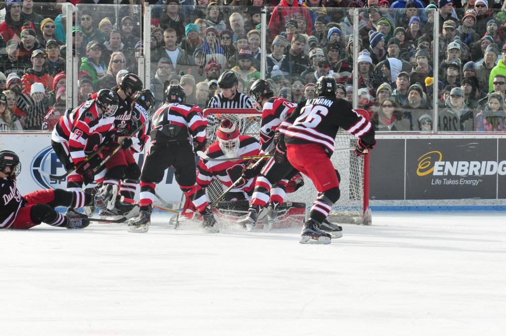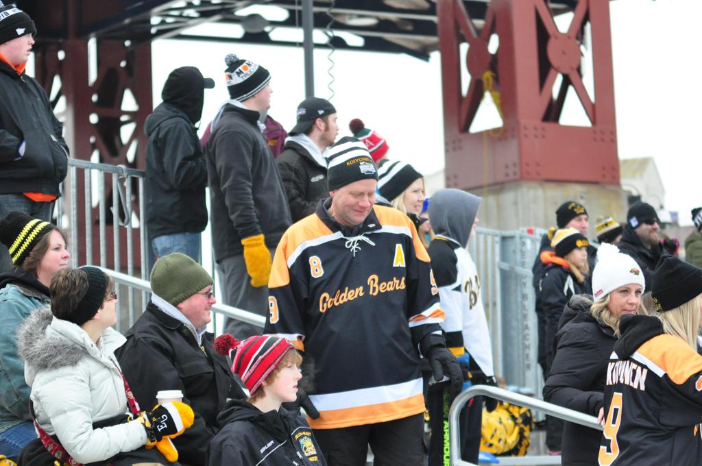 The afternoon marquee game between home-town Greyhounds of Duluth East vs. the visiting Panthers of Lakeville North began with Duluth hockey legends Jerry & Bob Fryberger dropping the ceremonial puck-drop. The game was quite the hard fought close game, between two Class AA powerful schools - both in striking red and black uniforms against the white ice - made for great images on the sunny day. Visiting Lakeville edged East by a close 3-2 regulation win. One thing that was quite odd and rather upsetting about HDM was the long LOUD hovering helicopter with camera man shooting footage through an open side door over the rink and crowd, it was so nousy on-site, spectators and players alike on the ice had a hard time hearing the referee whistles (fans on TV also had a hard time hearing the broadcast as the chopper blades were resonating through the microphones as well). Another quite upsetting thing, that led to collegiate changes going forward was - Duluth UMD Bulldogs Hockey team had a slated HOME game that afternoon - which Amsoil Arena was literally within eye site, and a few paces away by foot of the Duluth Bayfront Park, but were not apart of HDM. Fans at this time on social media started to gripe that this wasn't a Hockey Day Minnesota for all teams across the State - but was merely a Gophers Hockey Day, as the University of Minnesota had participated in every HDM to date. Things were about to change going forward in future years, to showcase ALL of the states Collegiate programs.
