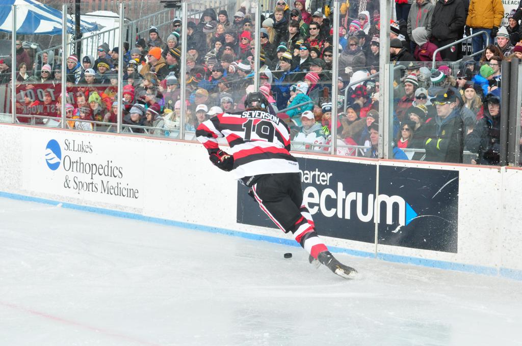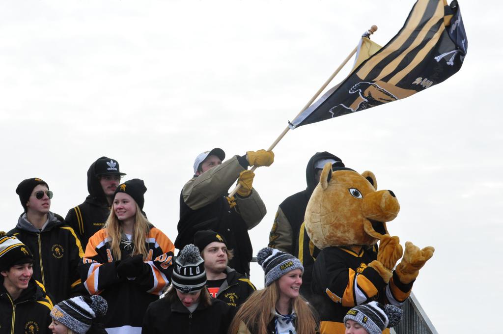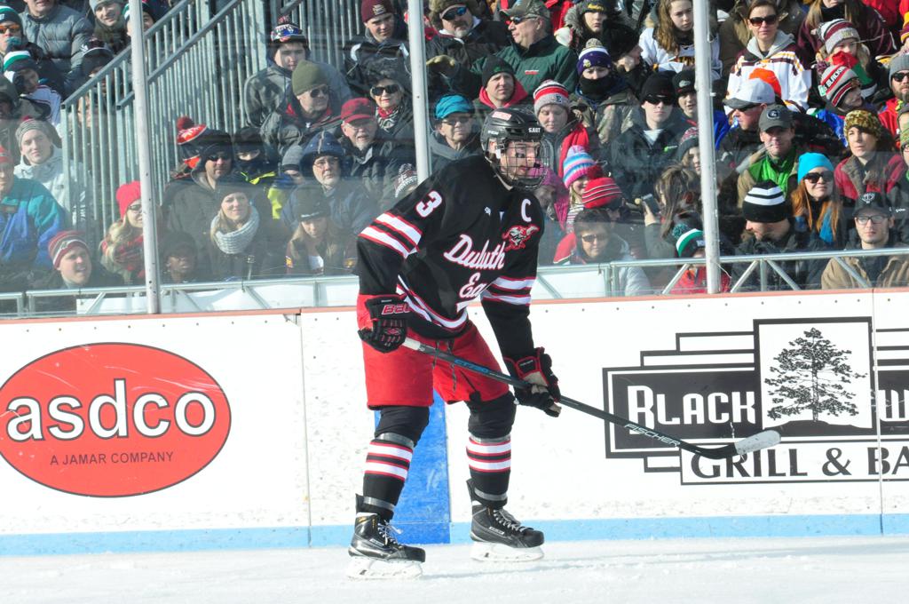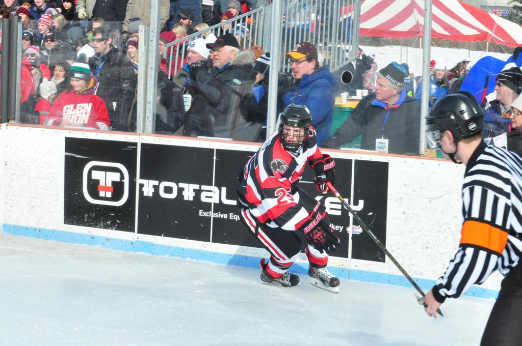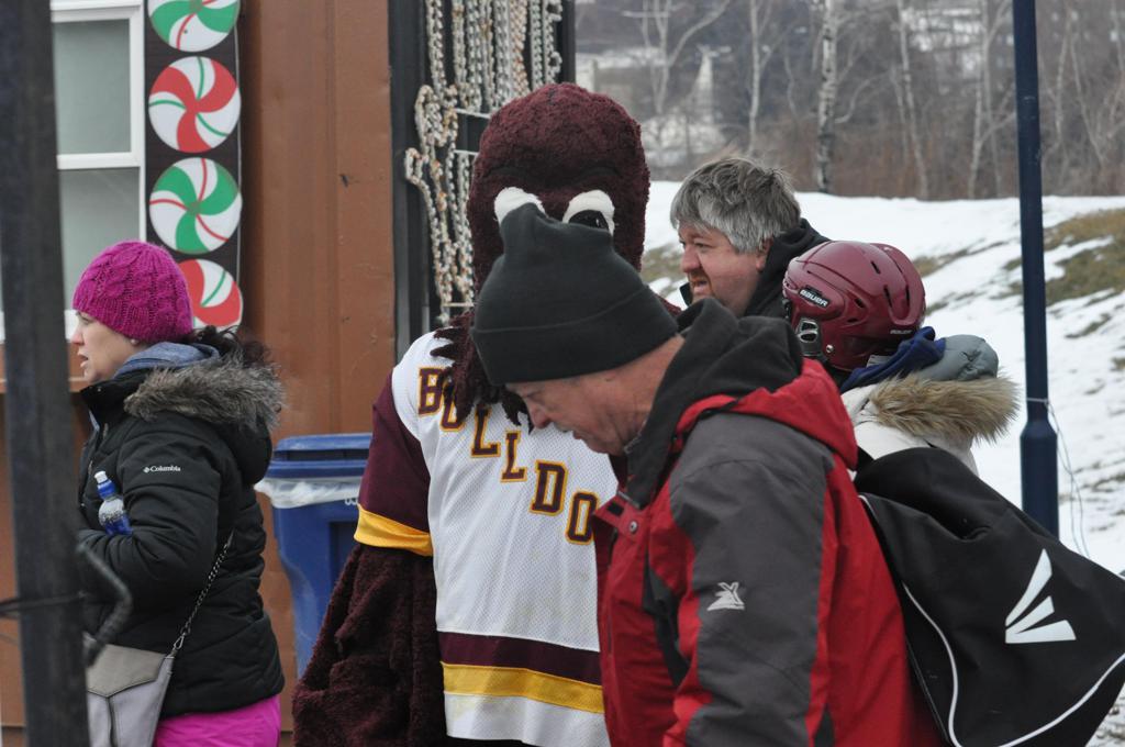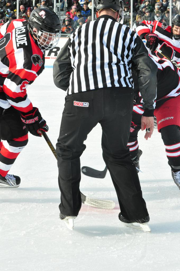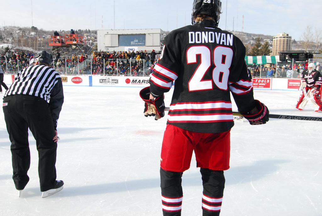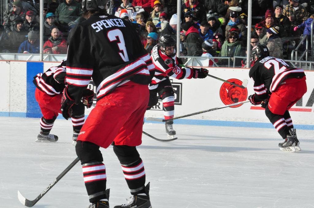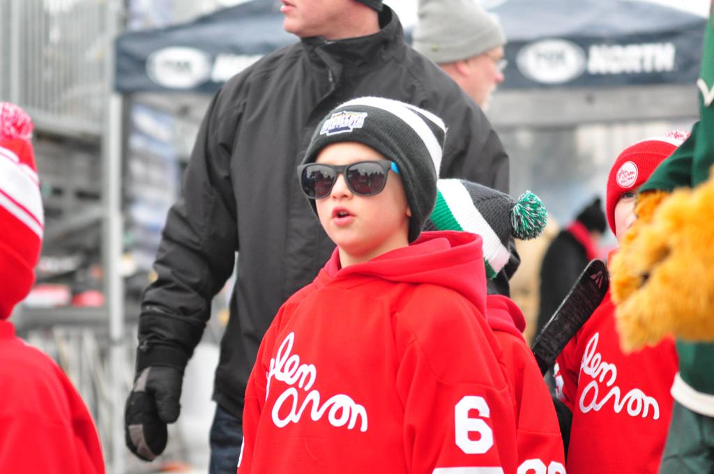 The afternoon marquee game between home-town Greyhounds of Duluth East vs. the visiting Panthers of Lakeville North began with Duluth hockey legends Jerry & Bob Fryberger dropping the ceremonial puck-drop. The game was quite the hard fought close game, between two Class AA powerful schools - both in striking red and black uniforms against the white ice - made for great images on the sunny day. Visiting Lakeville edged East by a close 3-2 regulation win. One thing that was quite odd and rather upsetting about HDM was the long LOUD hovering helicopter with camera man shooting footage through an open side door over the rink and crowd, it was so nousy on-site, spectators and players alike on the ice had a hard time hearing the referee whistles (fans on TV also had a hard time hearing the broadcast as the chopper blades were resonating through the microphones as well). Another quite upsetting thing, that led to collegiate changes going forward was - Duluth UMD Bulldogs Hockey team had a slated HOME game that afternoon - which Amsoil Arena was literally within eye site, and a few paces away by foot of the Duluth Bayfront Park, but were not apart of HDM. Fans at this time on social media started to gripe that this wasn't a Hockey Day Minnesota for all teams across the State - but was merely a Gophers Hockey Day, as the University of Minnesota had participated in every HDM to date. Things were about to change going forward in future years, to showcase ALL of the states Collegiate programs.