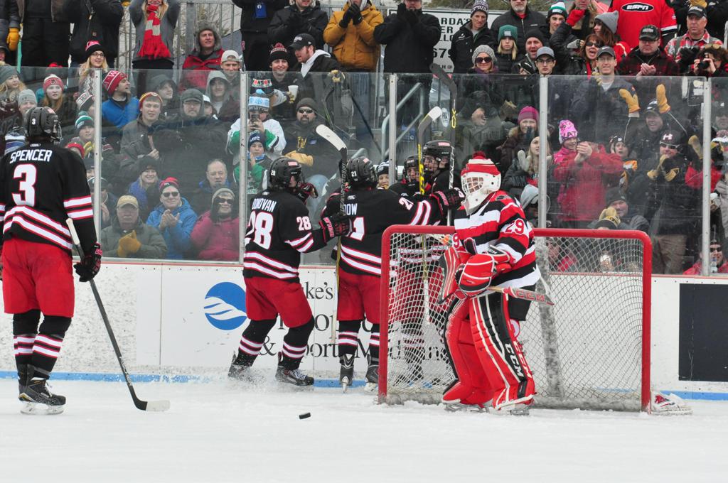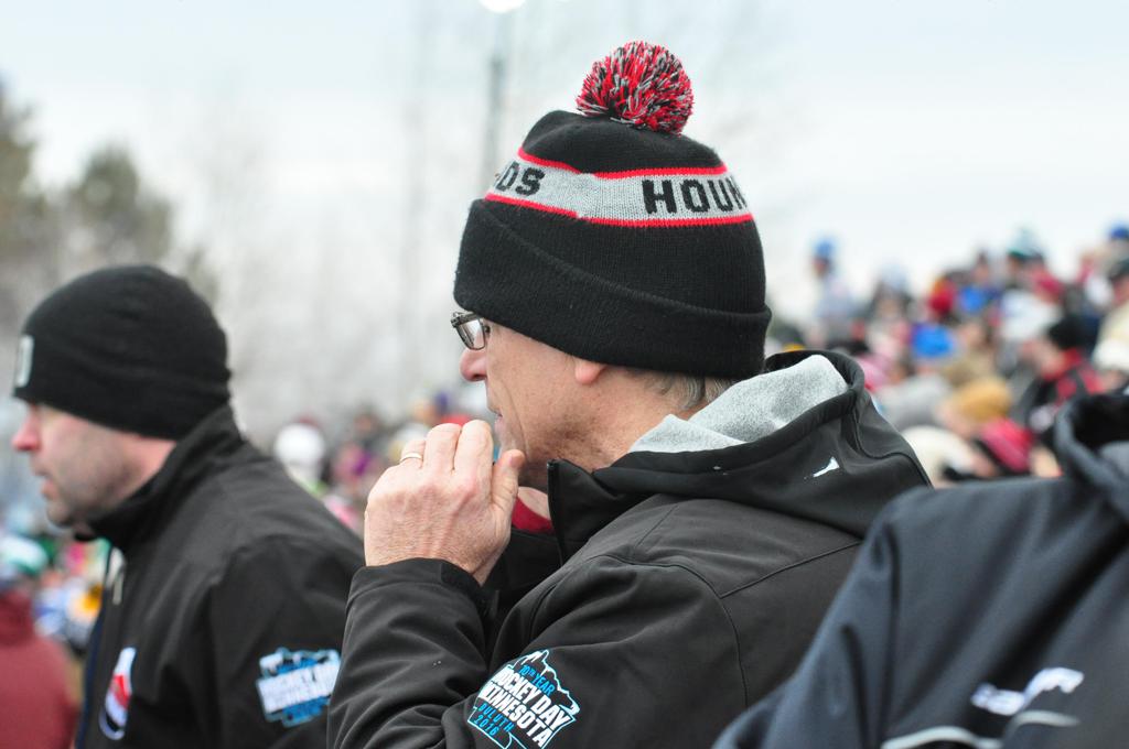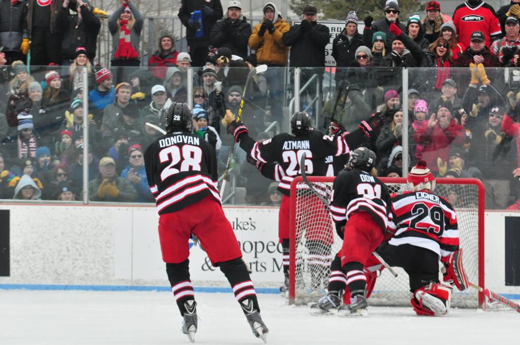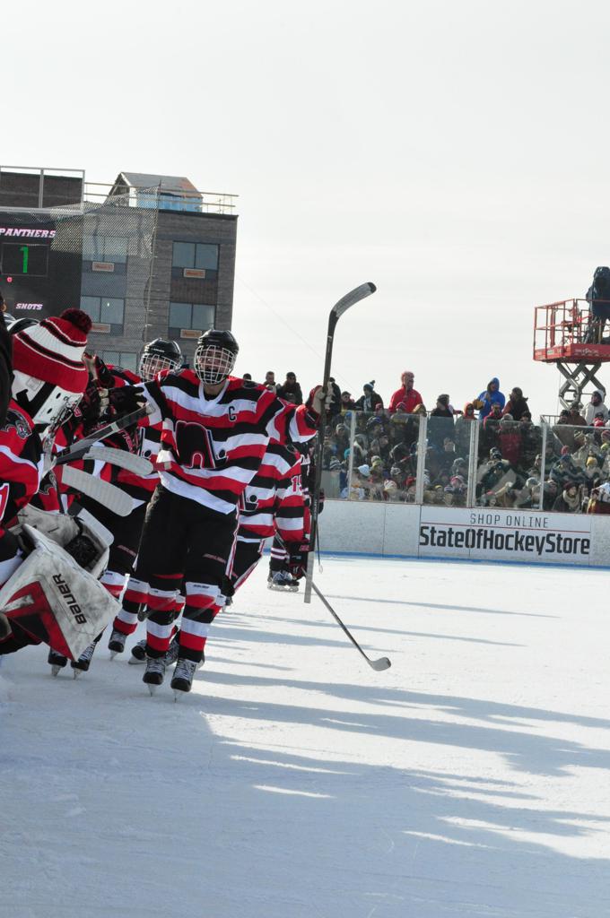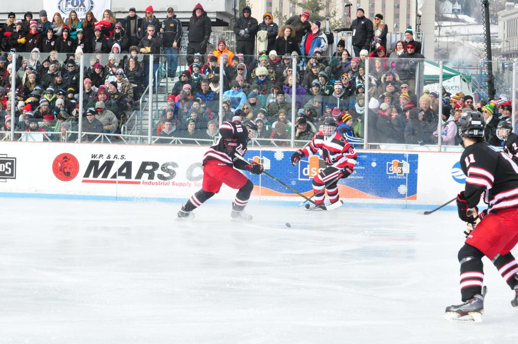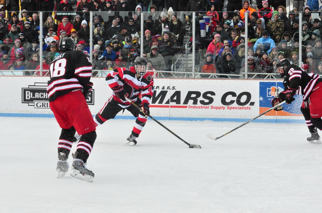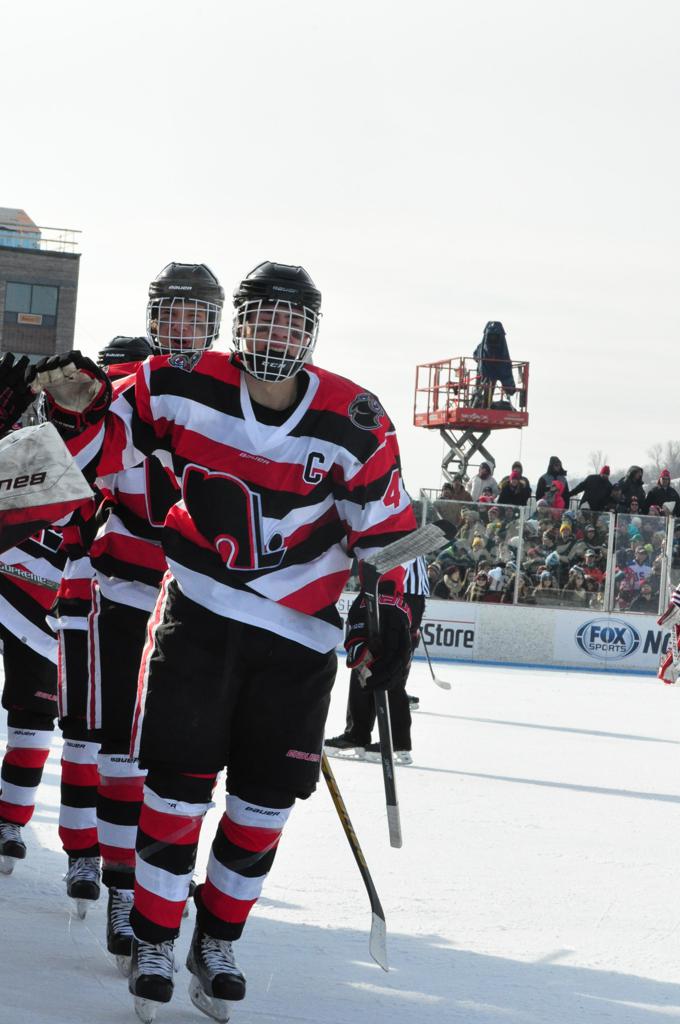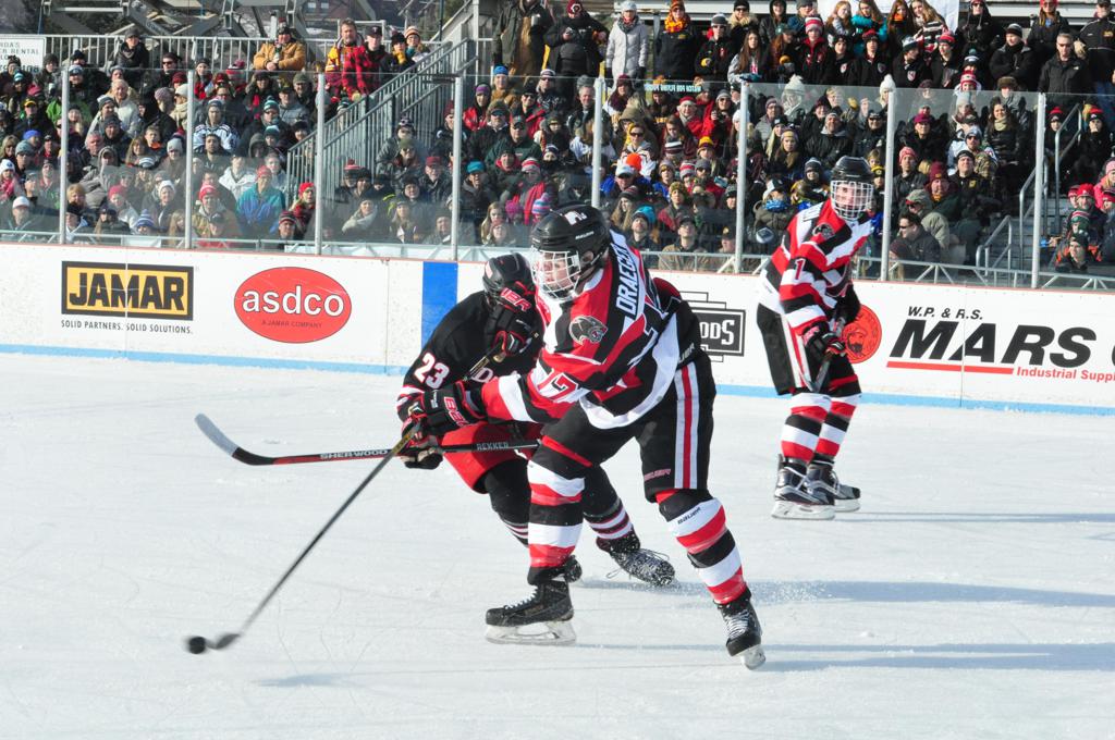 The afternoon marquee game between home-town Greyhounds of Duluth East vs. the visiting Panthers of Lakeville North began with Duluth hockey legends Jerry & Bob Fryberger dropping the ceremonial puck-drop. The game was quite the hard fought close game, between two Class AA powerful schools - both in striking red and black uniforms against the white ice - made for great images on the sunny day. Visiting Lakeville edged East by a close 3-2 regulation win. One thing that was quite odd and rather upsetting about HDM was the long LOUD hovering helicopter with camera man shooting footage through an open side door over the rink and crowd, it was so nousy on-site, spectators and players alike on the ice had a hard time hearing the referee whistles (fans on TV also had a hard time hearing the broadcast as the chopper blades were resonating through the microphones as well). Another quite upsetting thing, that led to collegiate changes going forward was - Duluth UMD Bulldogs Hockey team had a slated HOME game that afternoon - which Amsoil Arena was literally within eye site, and a few paces away by foot of the Duluth Bayfront Park, but were not apart of HDM. Fans at this time on social media started to gripe that this wasn't a Hockey Day Minnesota for all teams across the State - but was merely a Gophers Hockey Day, as the University of Minnesota had participated in every HDM to date. Things were about to change going forward in future years, to showcase ALL of the states Collegiate programs.