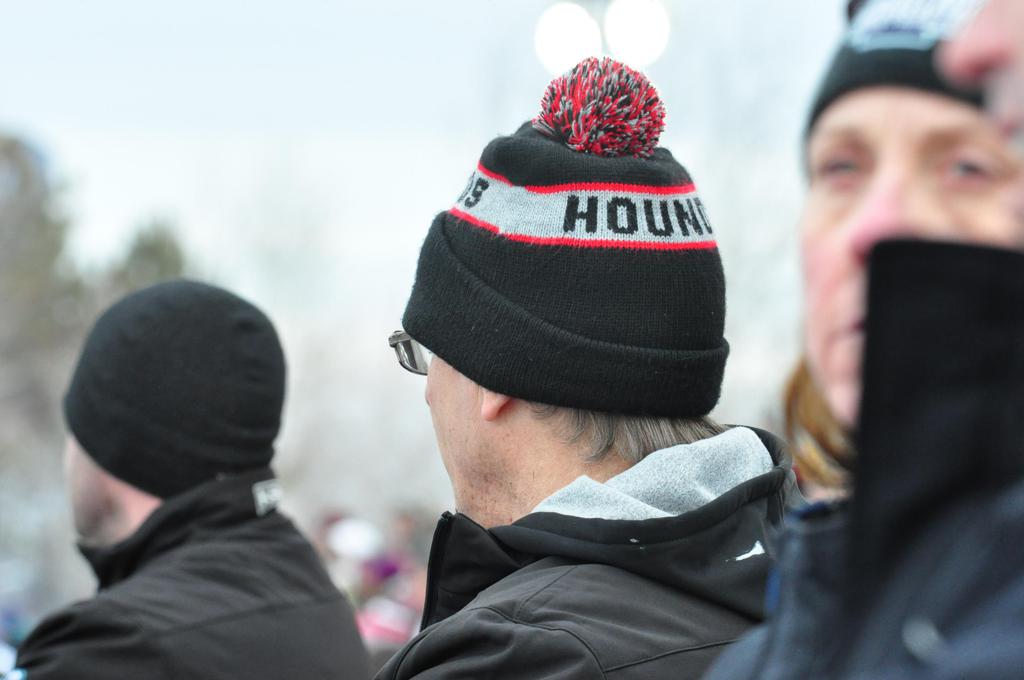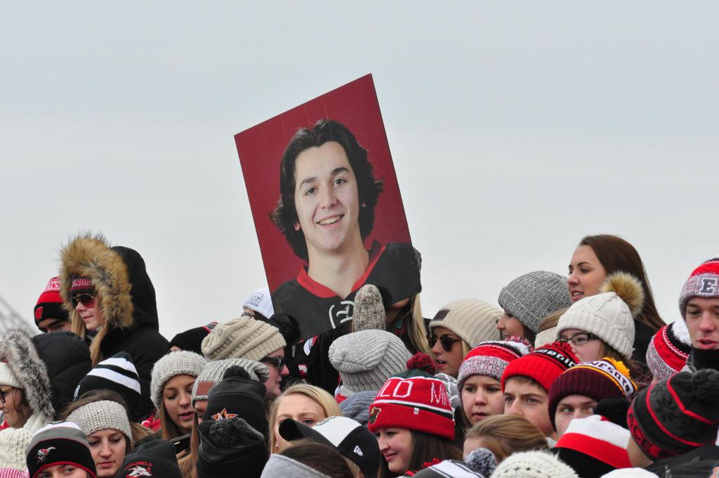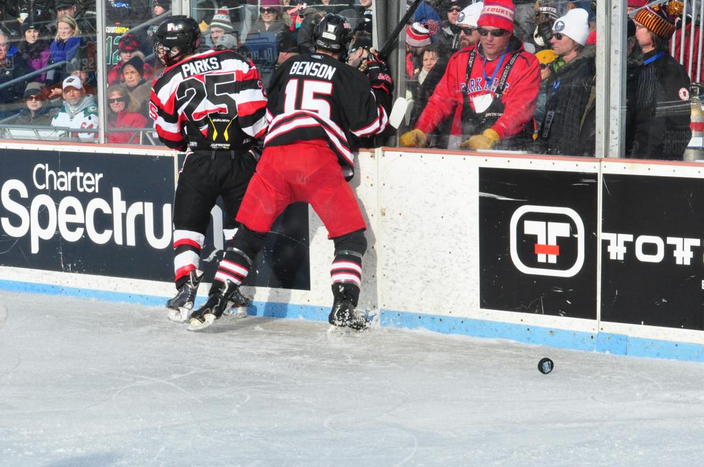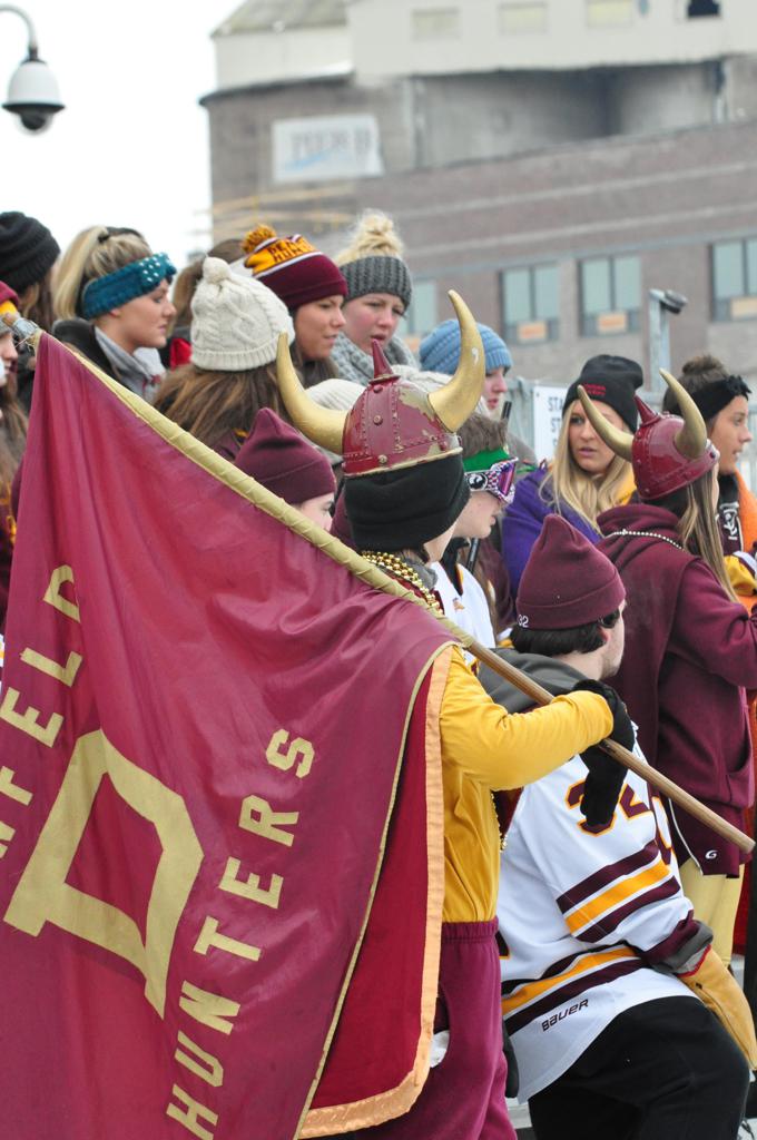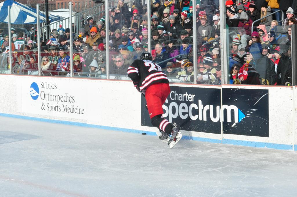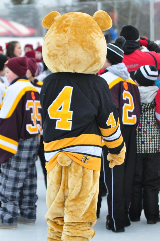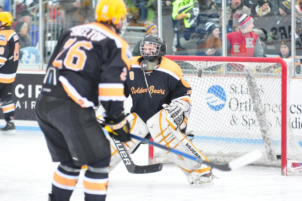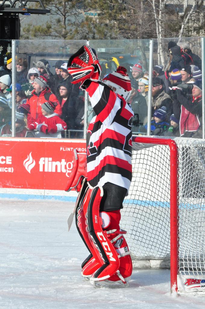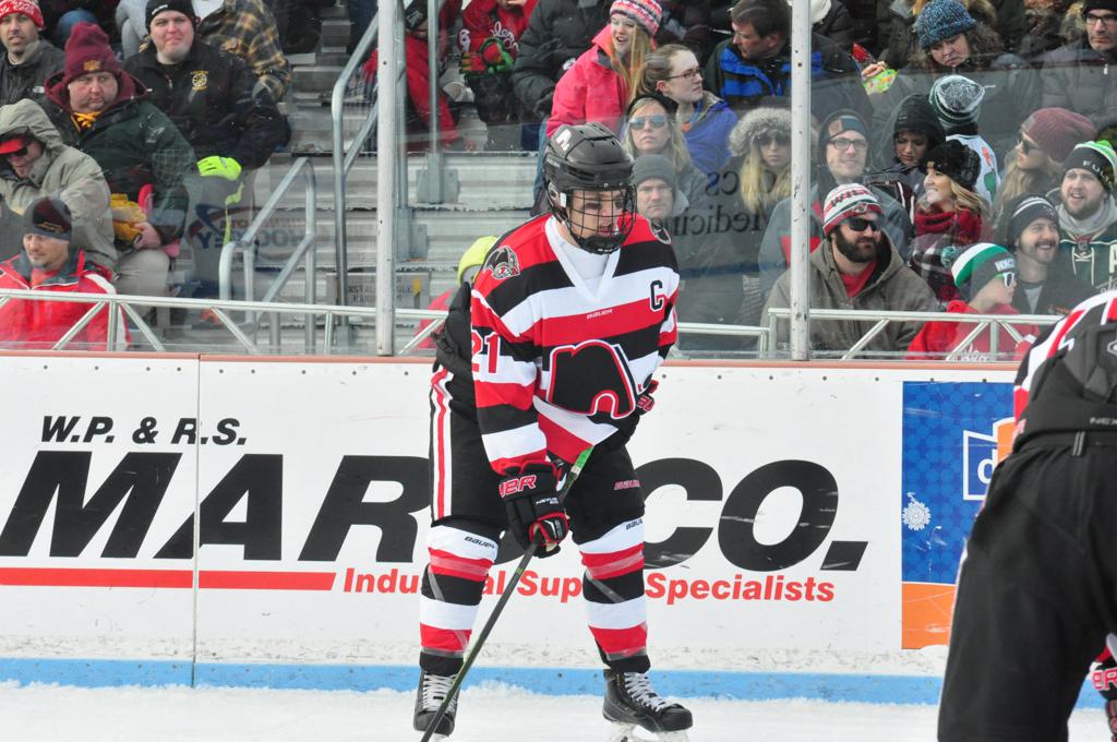 The afternoon marquee game between home-town Greyhounds of Duluth East vs. the visiting Panthers of Lakeville North began with Duluth hockey legends Jerry & Bob Fryberger dropping the ceremonial puck-drop. The game was quite the hard fought close game, between two Class AA powerful schools - both in striking red and black uniforms against the white ice - made for great images on the sunny day. Visiting Lakeville edged East by a close 3-2 regulation win. One thing that was quite odd and rather upsetting about HDM was the long LOUD hovering helicopter with camera man shooting footage through an open side door over the rink and crowd, it was so nousy on-site, spectators and players alike on the ice had a hard time hearing the referee whistles (fans on TV also had a hard time hearing the broadcast as the chopper blades were resonating through the microphones as well). Another quite upsetting thing, that led to collegiate changes going forward was - Duluth UMD Bulldogs Hockey team had a slated HOME game that afternoon - which Amsoil Arena was literally within eye site, and a few paces away by foot of the Duluth Bayfront Park, but were not apart of HDM. Fans at this time on social media started to gripe that this wasn't a Hockey Day Minnesota for all teams across the State - but was merely a Gophers Hockey Day, as the University of Minnesota had participated in every HDM to date. Things were about to change going forward in future years, to showcase ALL of the states Collegiate programs.