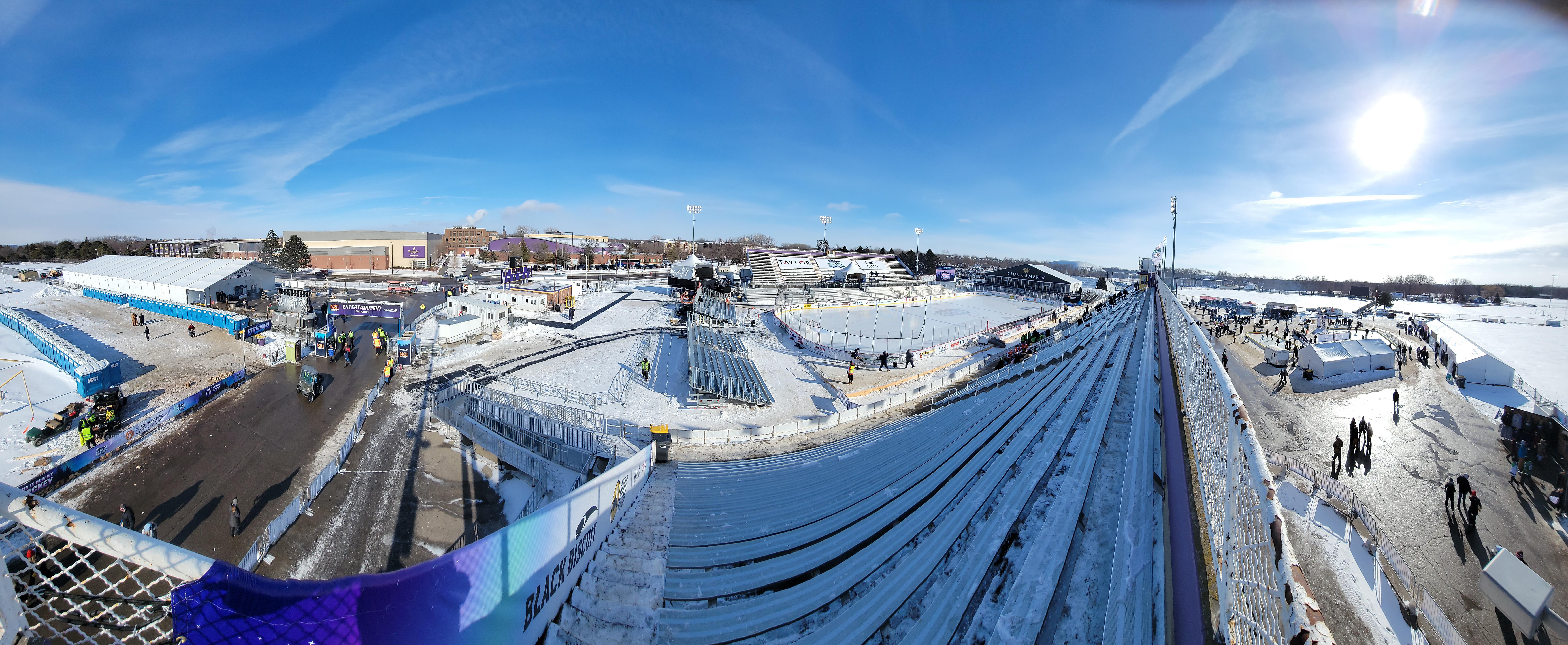 20,000 fans - 500+ volunteers. This is How We Hockey was the motto for #HDM2022 in southern Minnesota Mankato for the 2022 hockey day Minnesota festivities - the farthest southern city in Minnesota for HDM to date. The official game program for HDM as shown proclaimed it was the 15th Annual Hockey Day, where as the telecast on Bally Sports North (BSN) proclaimed it as the 16th Annual year. The event committee in Mankato had an extra year to plan & prepare due to COVID making sure HDM in the Maverick country wouldn't be un-done and promised to be the biggest and best showcase yet for HDM's illustrious 16 year history that began in 2007 on Baudette Bay, and the Maverick faithful didn't disappoint! It truly was a festival of festivals, party of parties, and a Minnesota hockey celebration of celebrations - and is truly remarkable what HDM has now become over the years from it's humble beginning next to Willie the Walleye park as a single Hockey DAY, to a week long Hockey WEEK with over 5 days of games as apart of the main HDM on Saturday. From the adjacent festival, vendor, food & beverage trucks, two Nice-Rink skating and boot hockey rinks for fans to take part in activities, and an enormously LARGE heated tent with night-time concerts on Thursday night in Johnny Holm band, and Shane Martin Friday night made it one of the largest to date hockey festival areas of HDM that rivals that what St. Cloud HDM set the prior mark. The refrigerated ice sheet on the field of dreams that Vikings WR Adam Thielen etched his legacy atop the grassy playing surface, where the main rink was held at Blakeslee Stadium - home of Mav Football and former Minnesota Vikings training camps which made this feel like a mini NHL Stadium Series outdoor game, that will likely become the new benchmark of who can outdue what Duluth started with the adjacent festival park, St. Cloud tuned up, to what Mankato put the exclamation mark on the end of the sentence in 2022! In usual fashion for prior Hockey Day Minnesotas' of yesteryears, weather has played a large factor in the days story from; Baudette extreme cold, Moorhead warm/sunny day ice fell apart, Grand Rapids extreme wind across the lake, Hermantown rain made ice mushy, Bemidji VERY frigid temp, to Minnetonka - where literally no outdoor ice was made and was moved sadly indoors. Mankato can add to that weather played a factor list with snow....LOTS of snow that fell for another first at Hockey Day, a MEN'S outdoor collegiate game that was held on the outdoor rink for the broadcast/televised HDM between the home-town Mavs vs. newcomer to the D1 Men's hockey scene in St. Thomas. During play stoppage and TV timeouts it required an army of local volunteers on skates, and the ever hard-working Arena Warehouse team to clear the snow accumulation that fell & fell. An estimated over 10,000 people packed the stands to see the Mav mascot Stomper give high fives to fans, when the home team truly stompered the visiting Tommies 7-1 behind Sophomore #10 David Silye hat-trick under the lights and snow. David was asked in the post game presser: when was the last time you scored a hat-trick? "A long time ago in Canada as a kid" he exclaimed with a grin, who growing up himself in Ontario, Canada "will remember this day forever playing with my teammates [that] brought back memories of my youth playing outdoors".