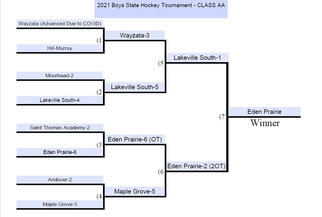 * Hill-Murray boys qualified for 2021 Tourney, but sadly withdrew from entire Tournament x1 day before they were due to appear in Class AA quarterfinal game with Wayzata. Although no Pioneer player was ill, a player in sectional championship game vs. White Bear Lake had a + test result, leading to a described Minnesota Department of Health COVID team exposure, and mandatory seven day quarantine period. A temporary restraining order/lawsuit was filed mutually by several Hill-Murray families, but was quickly thrown out by seated Judge. Wayzata, in a very classy move, offered to move the Class AA quarterfinal contest to Thursday (which Pioneers would have been out of MDH quarantine time of 7 days, from date of exposure) - but MSHSL declined to do so, leaving no other option but to withdraw Hill-Murray from Tournament as JV players (see Hermantown roster) were either not available to play in game in place of Varsity, nor had skated since season finale.