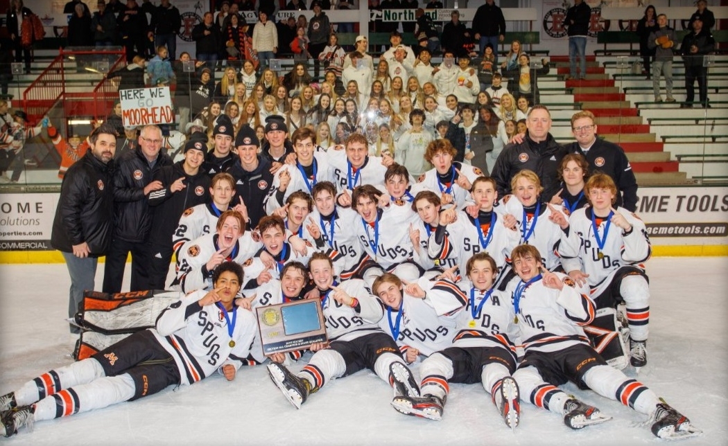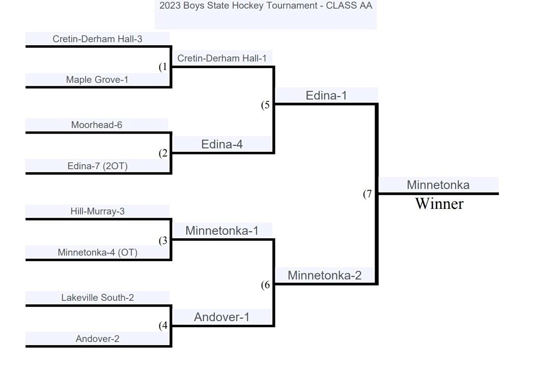 Warroad held a 3-1 lead in the second period and was in front 5-3 four minutes into the third period. Mahtomedi surged at that point, with Peyton Sunderland scoring his second goal of the season at 7:08 and Drage scoring at 11:00 and 15:40 to send it into overtime at 6-6. After a scoreless eight-minute extra session, the ice was resurfaced and play resumed. The outcome was settled when Jonathan Grove scored at 4:56 of the second overtime. Carson Pilgrim had a hat trick for Warroad, giving him 52 goals on the season.