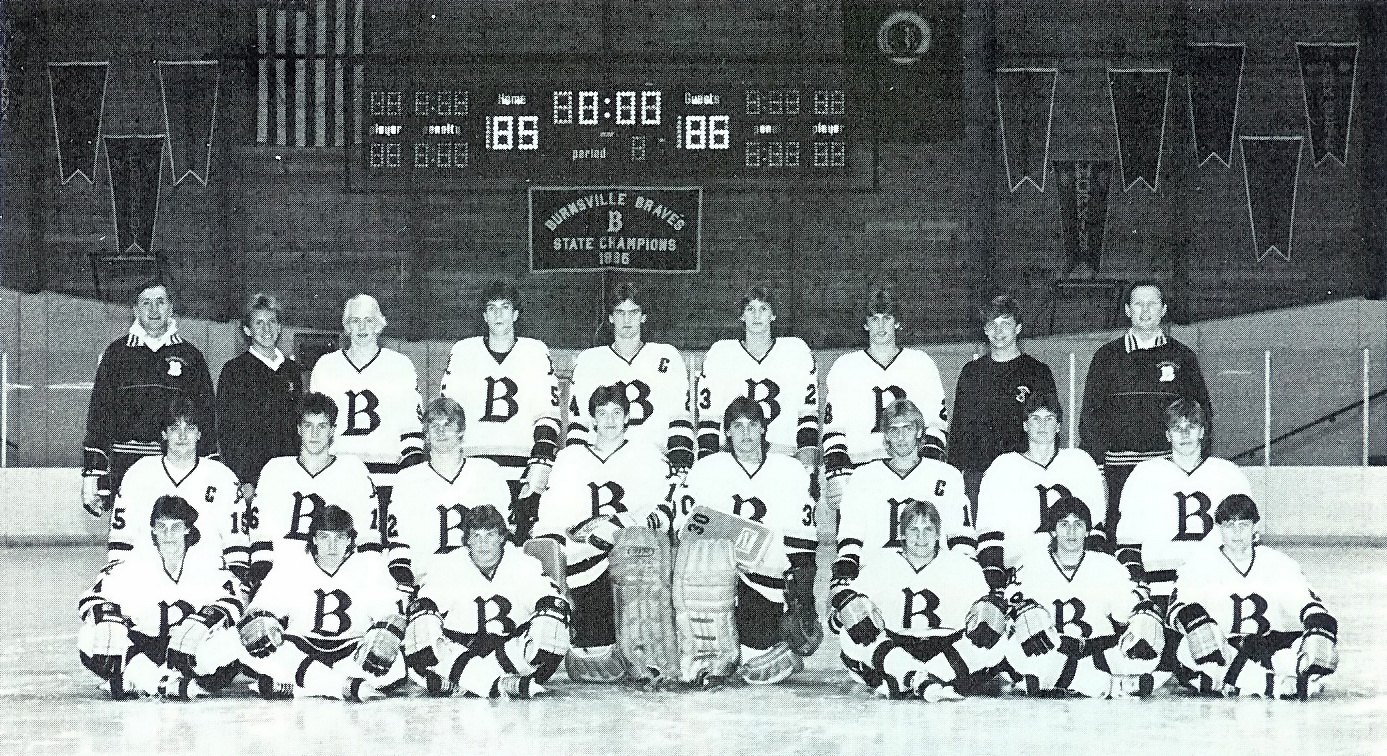 The same two teams from the 1985 championship game returned, and the same outcome, with a different margin, was the result. Burnsville defeated Hill-Murray, 4-1, for its second championship in four state tournament trips. Scott Bloom had two goal and an assist in the championship game for the Braves. Burnsville started its title defense with a 7-4 victory over South St. Paul in the quarterfinal and then defeated Duluth Denfeld, 3-1, in the semifinals. Hill-Murray defeated Richfield, 5-3, in the quarterfinals and then outlasted Hibbing for a 5-4 win in the semifinals.