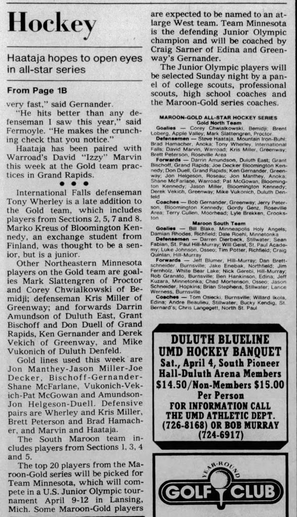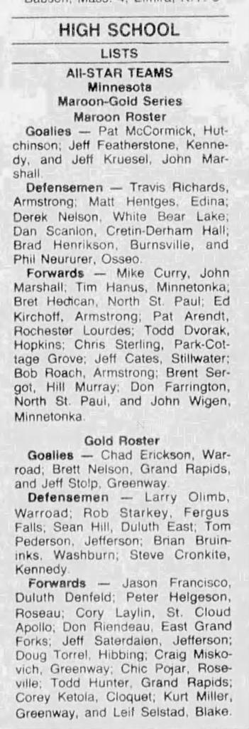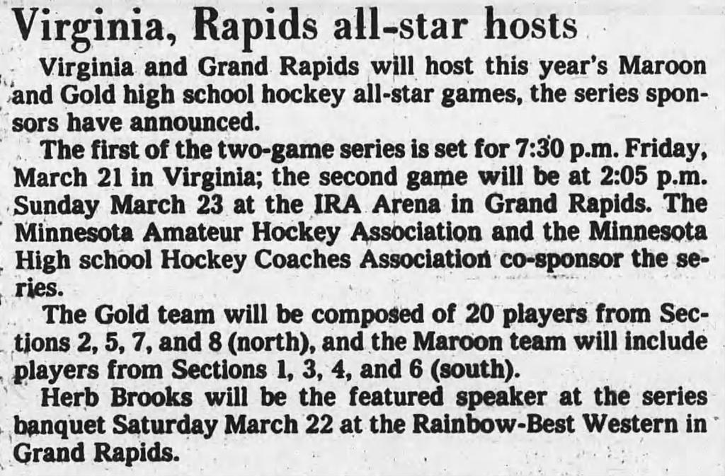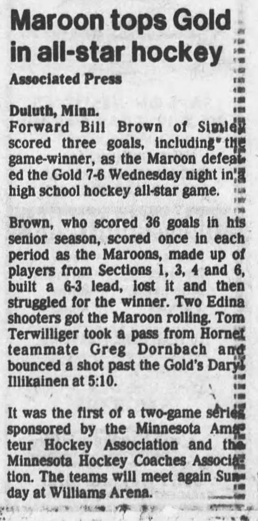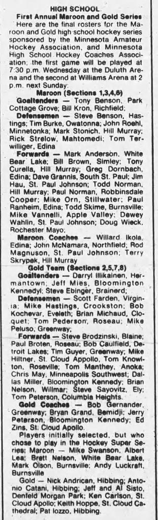 The Maroon and Gold High School All-Star Series, was developed by the late great Ted Brill in conjunction with support from Minnesota High School Coaches Association, and Minnesota Amateur Hockey Association (MAHA).