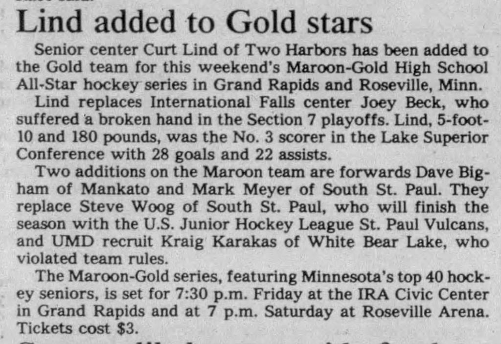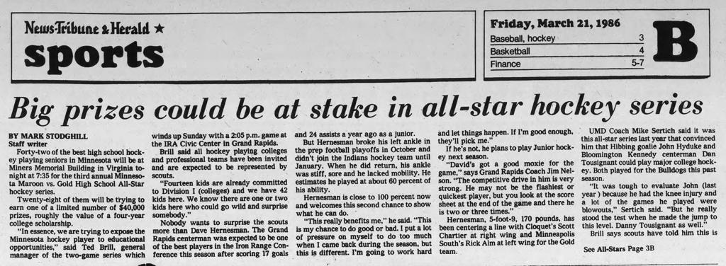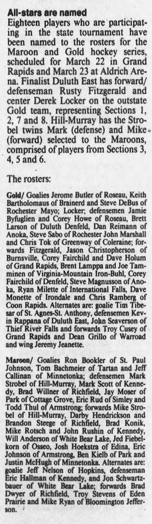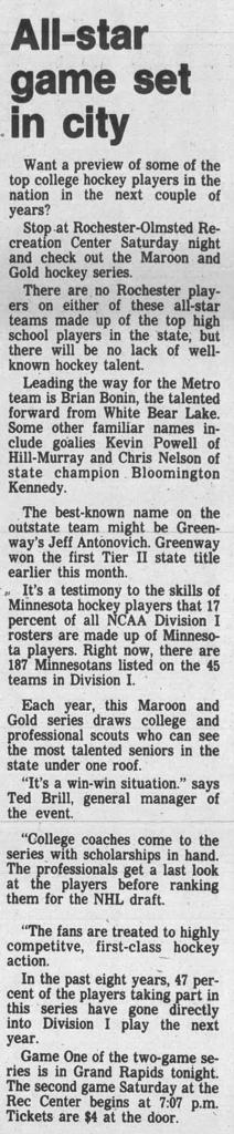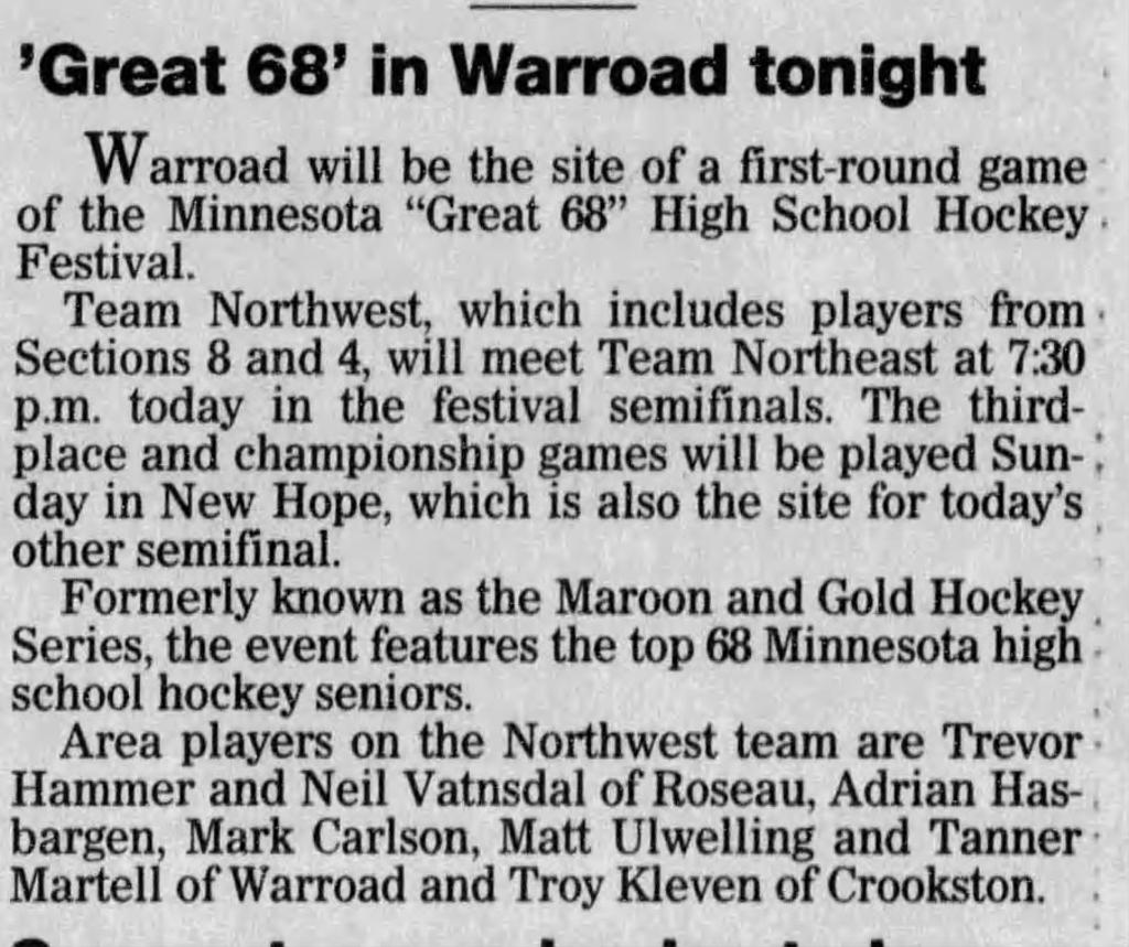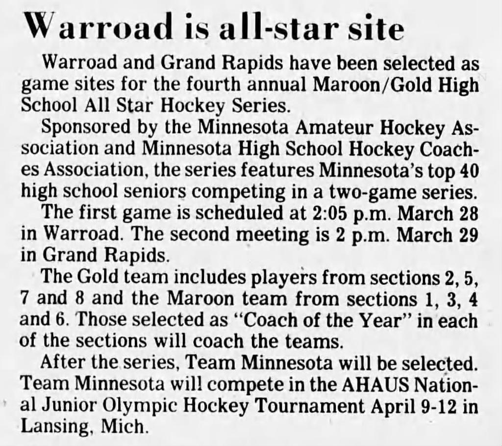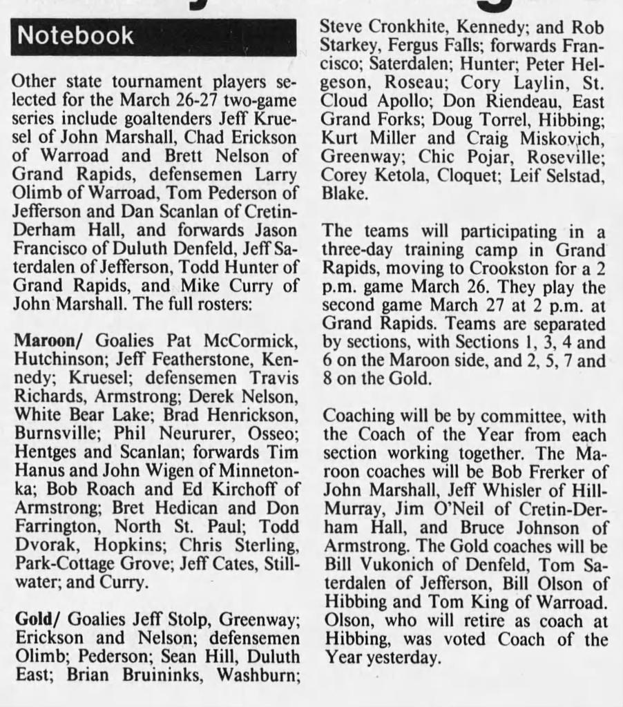 "It's a big opportunity for these kids. It's a showcase of Minnesota high school hockey talent. There is always tons of scouts there, and if the kids play well, they may garner some merit out of this thing" - Longtime Albert Lea Coach Roy Nystrom 1996.